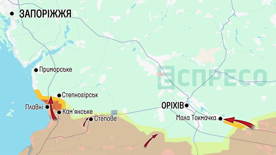 Карта бойових дій за 15-22 листопада, фото: ЕспресоРашисти шукають слабке місце в нашій обороні та пробують пробиватися через усі три лінії. До траси напряму їм залишилось близько 8-ми км. Однак вони спрямовують свої зусилля північніше - в район Тернуватого. Де на межі областей і в межиріччі Гайчура, Янчура і Вовчої наша лінія захисту не така потужна, як біля Гуляйполя чи Покровського. Окупанти вже атакували Єгорівку, а частину їхніх штурмових груп знищували й у Данилівці, що розташована на самій дорозі і може стати ключем до нашої оборони. Тут ворог може вийти в тил не тільки захисникам південного фронту та створити загрозу для Оріхова, але й обійти з флангу та почати облогу Покровського - першого міста на Дніпровщині.Фронт критично наблизився до ЗапоріжжяЛінія фронту на південь від Запоріжжя є однією із найбільш стабільних у цій війні. За майже 4 роки ворог тут наблизився до обласного центру менше, ніж на 10 км, а до околиць Запоріжжя залишилось ще 20 км. Однак останнім часом окупанти активізували свій наступ на Степногірськ – селище, яке є останньою перепоною для того, щоб росіяни змогли почати обстрілювати Запоріжжя із артилерії.
