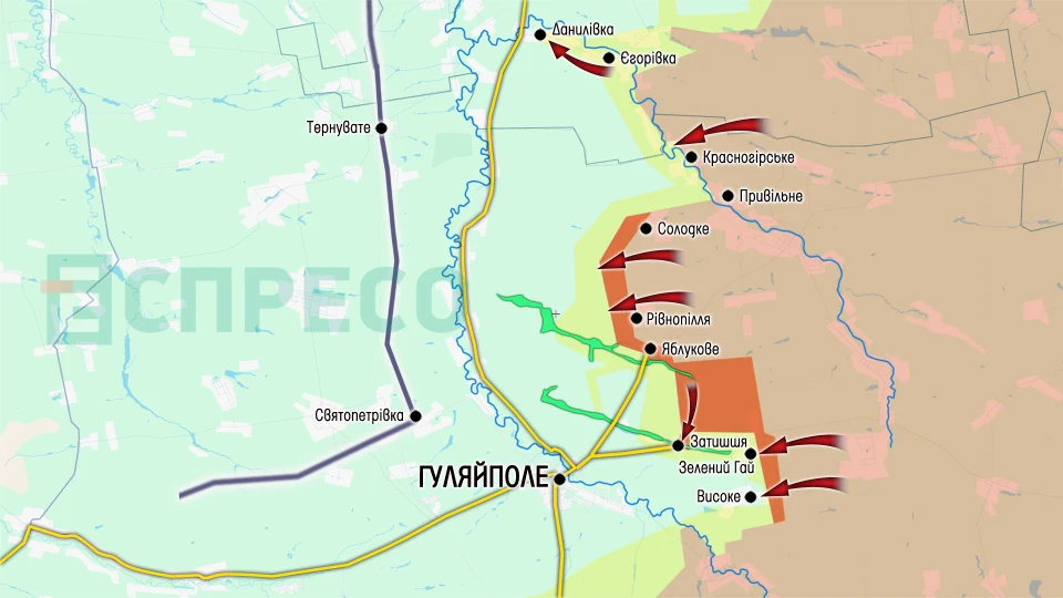 Карта бойових дій за 15-22 листопада, фото: ЕспресоБільшу частину десанту наші оборонці ліквідували, інших - взяли у полон. Втім, ворожа армія намагається утримати плацдарм біля Дачного, щоб і надалі мати можливість знову атакувати Новопавлівку. Захисники України натомість хочуть зачистити і цей плацдарм ще до настання сильних морозів, коли річка може замерзнути, а в окупантів з’явиться більше можливостей її форсувати. Гуляйпільська криза загрожує ДніпровщиніПісля прориву фронту на річці Янчур та стрімкого просування на 10 км у наші тили, росіяни дещо сповільнили темпи наступу. Вони захопили панівні висоти біля Рівнопілля і тепер рухаються по височині на південь і північ, щоб вирівняти фронт по флангах. В першу чергу ворог кинувся на південь, де багато років поспіль тримав оборону наш укріпрайон біля сіл Високе й Зелений Гай. За тиждень окупанти, на жаль, пробились на 5-6 км та захопили село Весела і зайшли у Зелений Гай, за яке зараз тривають бої. Наші оборонці перебувають під вогнем одночасно із трьох сторін, а тому оборона тут навряд чи триватиме довго і нашим воїнам доведеться відступати до Гуляйполя.