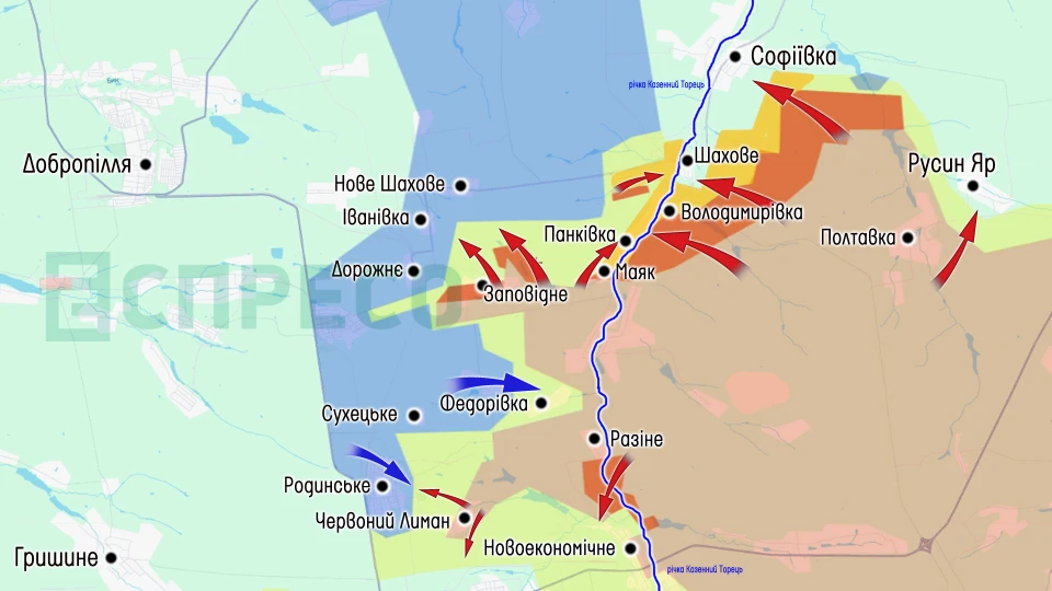 Карта бойових дій за 15-22 листопада, фото: ЕспресоНаступаючи вздовж обох берегів Сіверського Дінця, росіяни впритул підійшли до переправи у Дронівці, але не можуть її захопити, і відповідно - не можуть посилити свій наступ на Сіверськ із півночі. Однак, ворожі формування пробились через наші редути до східних та південних околиць Сіверська. Втім наразі їхні штурмовики діють за принципом: побачити Сіверськ і померти. Попри те, що путіністів фіксували вже й у центральних кварталах міста, - сили оборони України зуміли знищити їх усіх. А от на південних околицях, зокрема на вулиці Пушкіна - окупанти все ж закріпилися.Штурм Лимана і Сіверська демонструє далекоглядні плани росіян наблизитися до Слов'янська та спробувати обійти його із півночі. Ворог почав новий наступ на ДобропілліПоки ЗСУ закінчують зачистку росіян, які ховаються в єдиній посадці в районі між Шаховим та Шаховим новим, інші ворожі групи значно активували свої атаки з лівого боку Казенного Торця на Володимирівку і Софіївку. Володимирівка, яку Сили оборони звільнили у вересні, зараз знову майже повністю перейшла у руки рашистів. А в Шаховому кишить від кількості ворожих ДРГ. З лівого флангу ворог атакує з Полтавки на Русин Яр. Таким чином вони хочуть сформувати новий вектор наступу - паралельно попередньому: між Добропіллям і Костянтинівкою, який спрямовуватиметься на Дружківку.