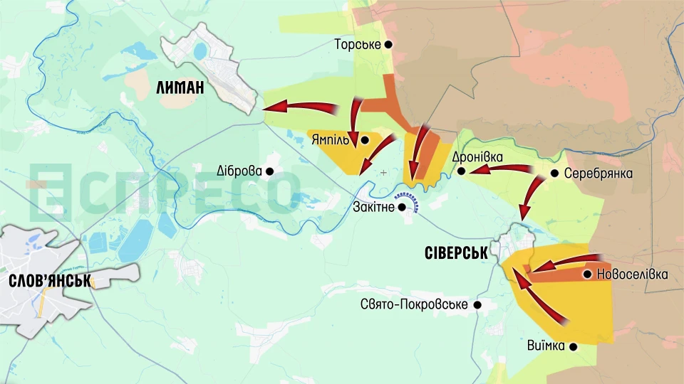 Знову міські бої у Сіверську та Лимані Місяць тому, повідомляли про перші вуличні бої в обох містах – коли до них дісталися окремі ДРГ ворога. З того часу сіра зона біля Сіверська та Лимана значно розширилась, а російські малі штурмові групи все частіше проникають в міста і вже починають там накопичуватись. Величезна сіра зона між Лиманом і Сіверськом утворилася завдяки суцільному лісовому масиву між ними. Під прикриттям дерев, ворог може уникати наших дронів та через відсутність суцільної лінії оборони – підходити максимально близько до міст. Втім, закріпитися в Лимані окупанти наразі не можуть, хоч і посилюють тиск на місто. Для полегшення наступу на Лиман - зс РФ хочуть спочатку захопити Ямпіль, який вже давно став суцільною зоною вуличних боїв. Але й тут рашисти не мають повного контролю, а тому намагаються прорватися на південь від Ямполя - у напрямку Діброви, щоб перерізати дорогу Лиман – Сіверськ, яка йде через Закітне, та обмежити наші логістичні можливості як для Ямполя, так і для Сіверська. Однак Сили оборони зустрічними атаками відбили наступи на дорогу, а ворожі ДРГ знищили.
