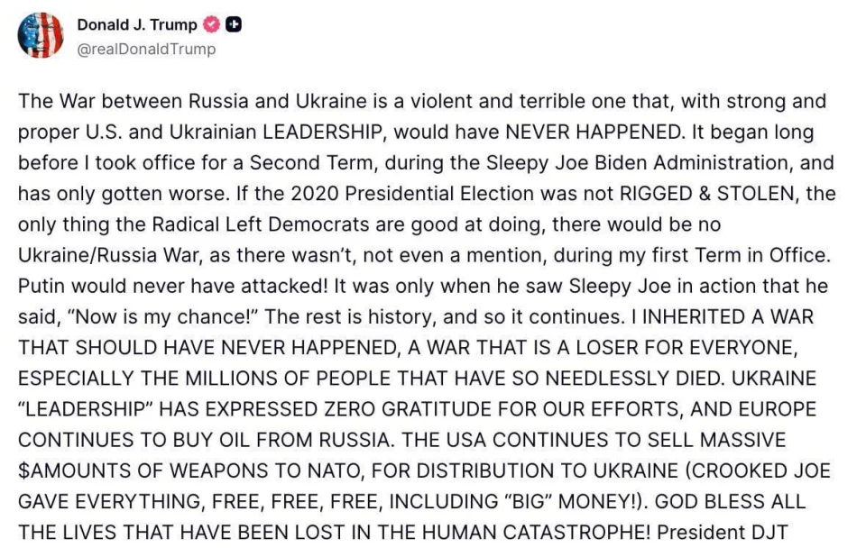 Відповідний допис президент США опублікував у своїй соцмережі Truth Social. Трамп висловив думку, що війна між РФ та Україною ніколи б не відбулася "за умови сильного та належного лідерства США та України". "Якби президентські вибори 2020 року не були сфальсифіковані та вкрадені – єдине, що вміють робити радикальні ліві демократи – війни між Україною і Росією не було б, як її не було, навіть згадки про неї, під час мого першого терміну на посаді. Путін ніколи б не напав!", - зазначив президент США. Він продовжив, що "успадкував війну, яка ніколи не повинна була відбутися", зазначивши, що вона "є програшною для всіх, особливо для мільйонів людей, які так безглуздо загинули". "Керівництво" України не висловило жодної вдячності за наші зусилля, а Європа продовжує купувати нафту в Росії", - написав Трамп.Американський лідер додав, що США продовжують продавати НАТО величезну кількість зброї, яку потім надсилають Україні, при цьому звинувативши Байдена у тому, що він нібито "віддав все безкоштовно".