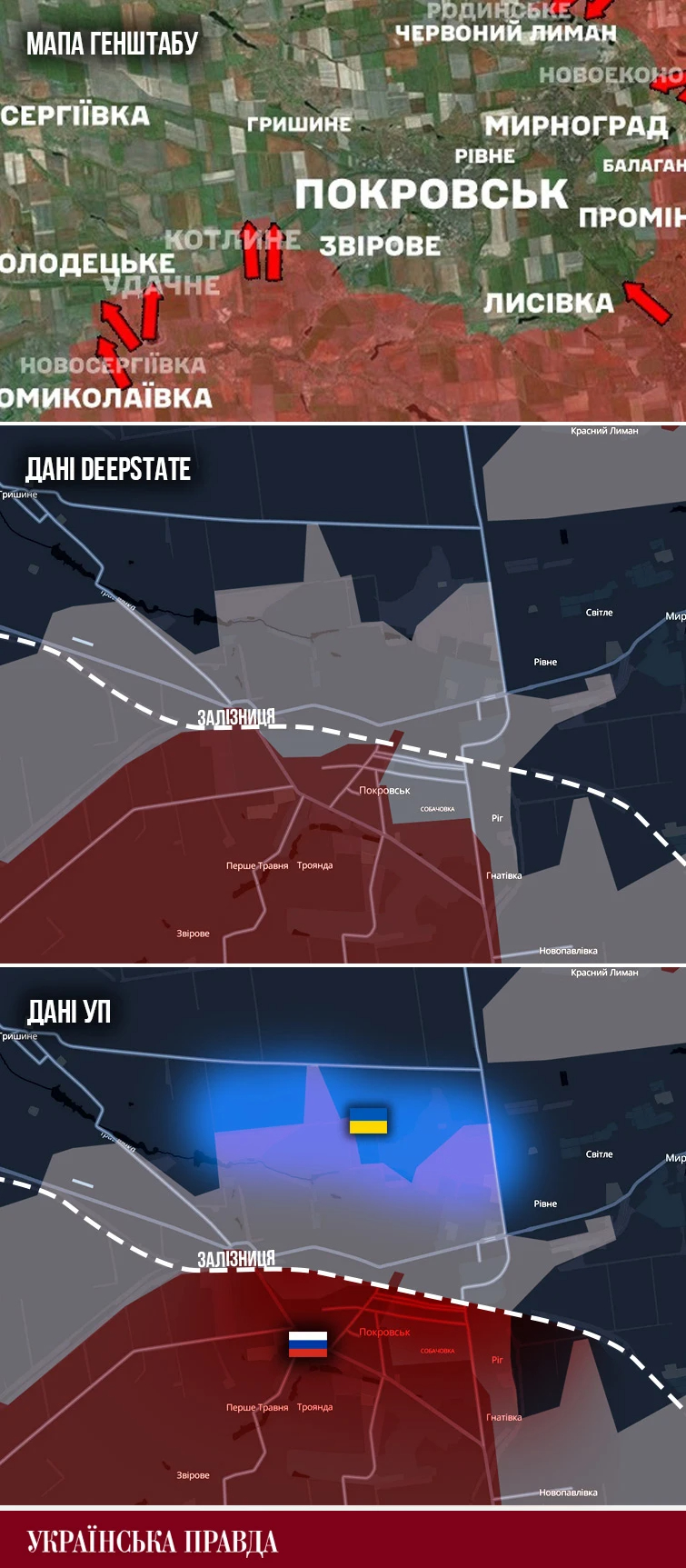 Дослівно матеріал: "Покровськ – великою мірою втрачений. На північній околиці міста все ще є українські позиції; втім, більша частина Покровська перебуває під контролем окупантів. Уся частина населеного пункту нижче залізниці, яка "розрізає" місто навпіл, за даними УП, перебуває під росіянами. Лінія бойового зіткнення, за інформацією "Української правди", проходить ледь не по північній околиці міста. Карта Генштабу по Покровському напрямку відстає від реальності щонайменше на місяць".