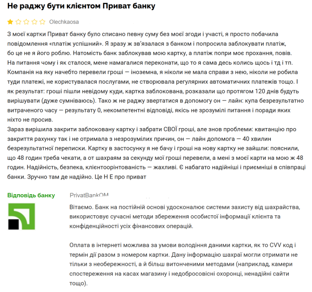 Проте банк замість блокування платежу заблокував саму картку і клієнтці повідомили, що розгляд справи може тривати до 120 днів. Скаргу жінка розмістила на порталі Мінфіну у розділі відгуків. У своєму повідомленні користувач з ніком Olechkaosa описала, що жодного разу не мала справ з компанією, якою надійшли кошти, не оформляла підписок на її послуги та не створювала регулярних автоматичних платежів.