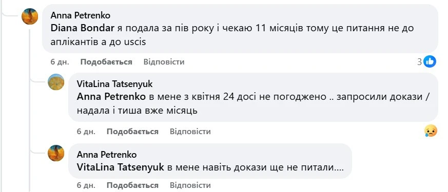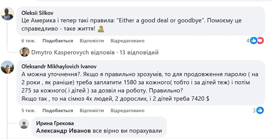 фото: коментарі на сторінці Selfreliance Association"Звертаємо увагу, що під час подання на re-parole на вашій карті має бути достатня сума для списання цього збору. Ми вже стикалися з випадками, коли на кредитних картках або бізнес-акаунтах діють обмеження на транзакції понад 1000 доларів. Тому радимо мати цю суму на дебетовій картці або попередньо переконатися, що на вашій кредитній картці немає лімітів, які можуть завадити успішному списанню коштів", – попереджає Selfreliance Association.Тобто якщо людині схвалили re-parole, але він не має $1000, дозвіл скасують. Крім цього є ще регуляторний збір USCIS $580-630 за розгляд документів, але можна домогтись його скасування. При цьому вимога сплатити ці $1000 надходить навіть тим, хто подавав заявки на продовження гуманітарного пароля задовго до 16 жовтня, але не встиг отримати відповідь до цього числа. Тож є припущення, що рішення спеціально "притримували" до набуття чинності цього тарифу. Загалом на кінець 2024 року кількість українців, які перебували у США за програмою U4U оцінювали у 240 тисяч. Наразі, за різними оцінками, на цьому статусі залишаються 120 - 140 тис. осіб (частина змінили статус, частина виїхала зі США). Умовно, якщо всім цим людям доведеться отримувати повторний пароль після 16 жовтня, США зароблять 120 млн доларів. І це не враховуючи інших зборів, які платять мігранти. Також мігранти відзначають, що листи з запрошенням на повторну біометричну перевірку чи співбесіду часто приходять з запізненням – коли призначений час уже минув. Тому радять періодично перевіряти онлайн-кабінети USCIS, аби нічого не пропустити.