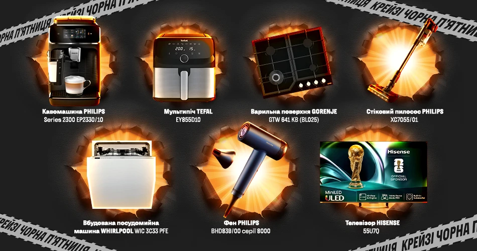 Фокстрот. Техніка, фото: ілюстративнеДля сучасної кухніКавомашина PHILIPS Series 2300 EP2330/10 (16 999* ₴ → 35 999 ₴, код 6910218) У ранкових справах важливо мати хоч одну незмінну річ. І нею цілком може стати улюблена чашка кави, яку ця кавомашина робить без зайвих клопотів. Philips EP2330/10 має три популярні режими, еспресо, чорна кава й капучино, і готує їх за лічені секунди.Фірмова система LatteGo швидко збиває м’яку молочну пінку, тож навіть звичайний ранок може перетворитися на маленький приємний ритуал.Мультипіч TEFAL EY855D10 (4 999 ₴ → 9 499 ₴, код 7018691) Об’єм на 7,5 л дозволяє без зусиль готувати на родину з чотирьох людей. Хочете запекти цілу курку? Легко! Хочеться хрумкої картопельки чи соковитої риби? Теж без проблем. Це той тип техніки, який буквально "приживається" на кухні з першого тижня. А ще мультипіч має режим дегідрації, тож може сушити яблучні чи грушеві чипси, а також шматочки м’яса. Виходять корисні снеки без зайвих добавок.Варильна поверхня GORENJE GT 641 KB (BL025) (10 449 ₴ → 11 499, код 6746598)Газова поверхня зі скляним покриттям – це красиве й дуже практичне рішення. Gorenje GTW 641 KB має продумане розташування конфорок, зручні чавунні решітки, які витримують важкий посуд, і потужний нагрів, що забезпечує рівномірне приготування страв. А ще її легко мити, оскільки скло стійке до подряпин і не вбирає запахів. А чудовим доповненням до кухонної техніки стане набір келихів LUMINARC RAINDROP (299 ₴ → 599 ₴, код 6887056). В комплекті йде 6 келихів. Такий набір ідеально підходить для щоденного використання й водночас гармонійно виглядає на святковому століДляприбирання, яке забирає півдня Вбудована посудомийна машина WHIRLPOOL WIC 3C33 PFE (16 999 ₴ → 21 499 ₴, код 6733386) Після ситної вечері або великого сімейного обіду найменше хочеться одразу переходити до миття посуду. Тут на допомогу приходить вбудована машина. Вона має високий клас енергоефективності A++, тож працює економно (всього 9,5 літрів на цикл), а ще вміщує до 14 комплектів, що вистачить навіть для великої компанії. У неї 14 програм миття: від швидкого циклу до інтенсивного режиму для каструль чи делікатного для келихів. У результаті кожна тарілка та склянка виходять бездоганно чистими, а ви отримуєте кілька зайвих хвилин для відпочинку.Стіковий пилосос PHILIPS XC7055/01 (13 999 ₴ → 34 999 ₴, код 6912904)Бездротовий пилосос – це вже про інший рівень комфорту. Philips XC7055/01 легкий, потужний і працює довго без підзарядки (до 80 хвилин автономності в Eco-режимі і до 30 хвилин в режимі Turbo-очищення). Йому легко дається і пил на підлозі, і дрібні крихти, і шерсть тварин на дивані завдяки різноманітним 4 насадкам, що йдуть в комплекті. Головна перевага в тому, що він пилососить і одночасно протирає підлоги. Для догляду та розваг Фен PHILIPS BHD839/00 серії 8000 (6 499 ₴ → 10 499 ₴, код 7051545)Потужний, але делікатний. Фен має технологію, що стежить за температурою і не дає волоссю пересихати. Повітряний потік рівномірний, сушить він швидко, а зачіска виходить гладкою навіть без стайлінгу. Загалом є 10 режимів, що дозволяють обрати найкомфортніший. Підійде тим, хто робить укладку щодня або хоче скоротити час на ранкові збори.Телевізор HISENSE 55U7Q (28 999 ₴ → 41 999 ₴, код 7134205)Це великий екран на 55 дюймів, насичені кольори, висока контрастність і дуже приємне зображення в темних сценах. Підійде як для стрімінгу, так і для спорту та ігор. Якщо давно хотіли зробити куточок для вечірнього відпочинку, у цей момент важко пройти 