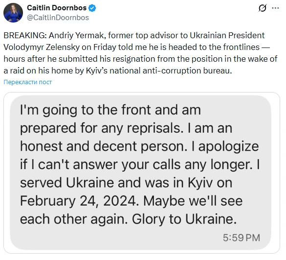 З Єрмаком спілкувалася репортерка New York Post Кейтлін Дорнбос. Скріни повідомлень журналістка також поширила у Х (колишній Twitter)."Я йду на передову і готовий до будь-яких репресій. Я чесна та порядна людина", - сказав він.Єрмак також перепросив, що більше не зможе відповідати на дзвінки журналістки. "Я служив Україні та був у Києві 24 лютого 2024 року (скоріше мав на увазі - 2022 рік, - Ред.). Можливо, ми знову побачимося. Слава Україні", - додав ексголова ОПУ."Мене осквернили, і мою гідність не захистили, попри те, що я перебуваю в Києві з 24 лютого 2022 року", – сказав він. "Тому я не хочу створювати проблем для Зеленського; я йду на фронт".Інших деталей щодо свого рішення (як от - коли він поїде на передову та в якій ролі) він не повідомив."Мене обурює бруд, який на мене виливають, і ще більше мене обурює відсутність підтримки з боку тих, хто знає правду", – додав Єрмак.