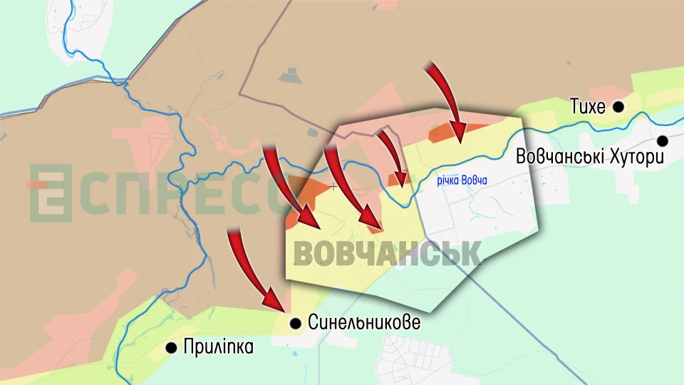Карта бойових дій за 22-29 листопада, фото: ЕспресоУ жовтні та листопаді росіяни суттєво посилили наступ на Вовчанському фронті, який до того був мало активний. Вони форсували Сіверський Донець на захід від міста та розпочали бої за село Синельникове. Контроль за цим селом дасть можливість ворогу зайти у фланг оборонцям Вовчанська та значно ускладнити логістику до міста. Також окупанти захопили кілька кварталів у самому райцентрі та атакують із Вовчанська у напрямку Синельникового, щоб з’єднатися зі своїми частинами та посилити удар у наш фланг.