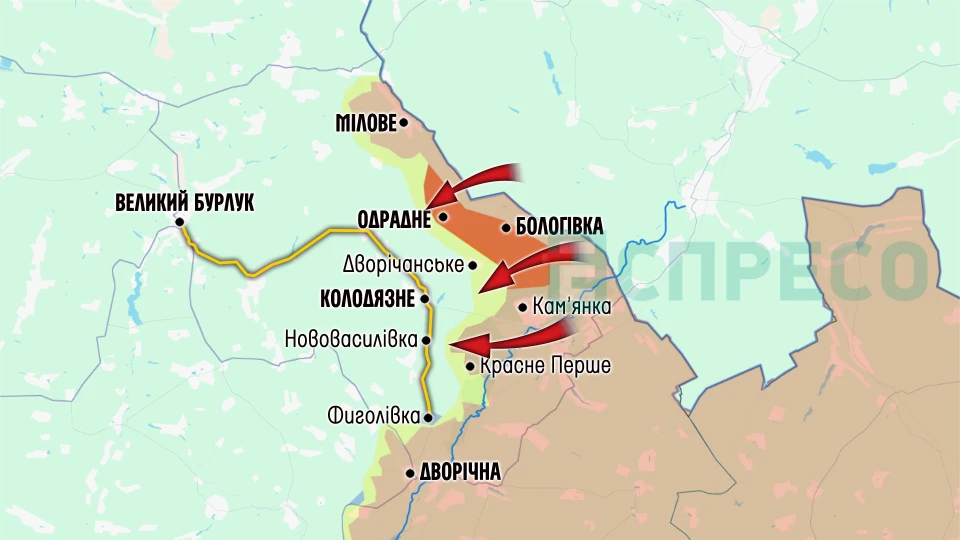 Карта бойових дій за 22-29 листопада, фото: ЕспресоВ ширшій перспективі рашисти хочуть зайняти всю прикордонну смугу від Вовчанська і аж до Осколу, щоб розширити свої можливості наступати вглиб Харківщини. На захід від Осколу вони вже створили два таких плацдарми. Один на правобережжі Осколі, від кордону і до Куп’янська, довжиною в 34 км та максимальною глибиною в 5 км в районі Дворічної. У листопаді вони зосередились над розширенням зони контролю вздовж кордону. Від прикордонного пункту в Міловому і на схід аж до Осколу ворог закріпився на плацдармі завдовжки у 26 км та 4 км глибини. Цього тижня путіністи після кількамісячних боїв захопили прикордонні села Одрадне і Бологівку та почали штурм Дворічанського, за яке зараз Сили оборони ведуть бої та мають вдалі контратаки. Основна їхня мета – це наш укріпрайон в Колодязному. З Одрадного ворог планує атакувати на дорогу західніше Колодязного, щоб перерізати один з двох логістичних шляхів. Інший вони атакують в районі Нововасилівки.