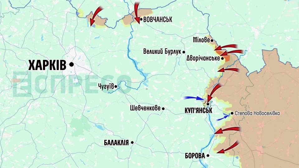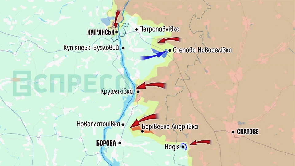 Карта бойових дій за 22-29 листопада, фото: ЕспресоІз тих сотень росіян, які прорвалися до міста більшість знищили Сили оборони, а ще кілька десятків, більше переховуються по підвалах та ведуть локальні бої практично по всій території міста. ЗСУ поступово зачищають захід та центр Куп’янська, а ворог контролює 15-20%, здебільшого на півночі. В середині міста наші і ворожі позиції змішалися і деякі переходять з рук в руки по кілька разів. Але через те, що ворог не отримує належне підкріплення та кількісно суттєво не зростає. Все тому, що ЗСУ продовжують утримувати свій клин, який вони вбили між Радьківкою і Ківшарівкою, а також продовжують наступати до Осколу в напрямку Голубівки. Якщо наші військові дійдуть тут до Осколу і зможуть надійно закріпитися, то Куп’янськ врешті врятований і швидко остаточно зачищений.І саме через ситуацію в Куп’янську, зс РФ змушені проводити локальні наступи в інших ділянках Харківщини, щоб відволікти наші резерви і не дати остаточно повернути контроль над містом. Ворог не значно, але посилив атаки в районі Вовчанська, на прикордонні в напрямку на Великий Бурлук, а також на лівобережжі Осколу.
