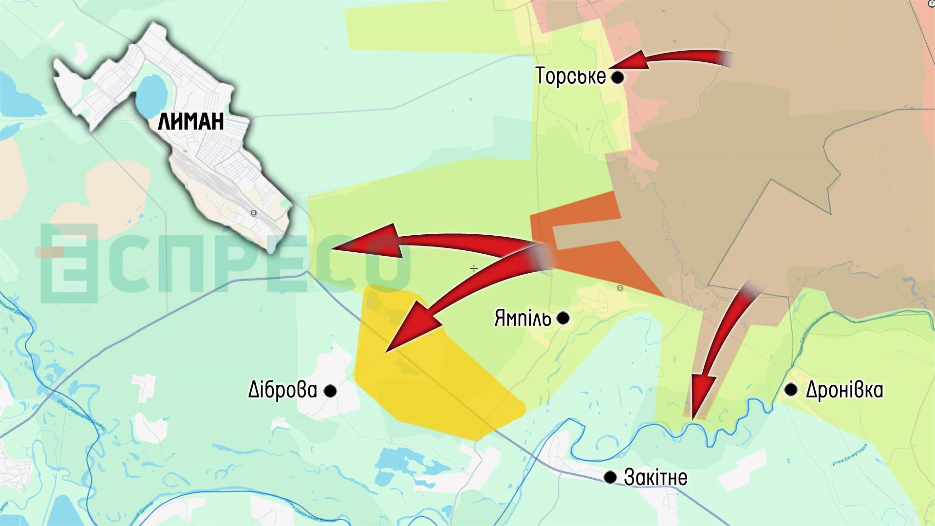Карта бойових дій за 22-29 листопада, фото: ЕспресоТаким чином вони вже класично готуються перерізати нашу логістику, яка й так є доволі складною в цих лісистих та болотяних місцях. Ситуація є доволі складною та все залежить від того скільки ворог зможе зібрати тут резервів та чи ЗСУ зможуть належним чином використати свої наявні ресурси, адже всі резерви кинуті під Покровськ і Гуляйполе. У випадку продовження просування росіяни можуть почати наступ в наші тили в районі Великого Бурлука та спробувати перерізати логістику для Куп’янська. Адже вони марять реваншем за контрнаступ ЗСУ в 2022 році та хочуть повернути війні під стіни Харкова, Чугуєва, Балаклії та Ізюма. Погіршення на Лиманському та Слов’янському фронтахРашисти суттєво посилили свій наступ на Лиманському фронті, сконцентрувавши його на селище Ямпіль. Кількісно переважаючи, ворог атакував одразу з двох флангів. З одного росіяни змогли інфільтруватися аж до дороги з Лимана на Закітне, а з іншого східніше селища прорвався до Сіверського Дінця в районі Дронівки. Через це Сили оборони вимушено поступово відступають. Але мої за Ямпіль все ще тривають і окупанти не встановили тут свого повного контролю. Однак перерізання логістики по дорогах з Лимана на Дронівку і Закітне ускладнює наше становище як в самому Лимані, так і в Сіверську.