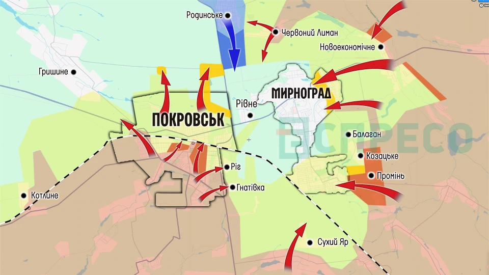 Карта бойових дій за 22-29 листопада, фото: ЕспресоМи втрачаємо центр Покровська, але тримаємо флангиВ Покровську ситуація ускладнилася до неможливого. Росіяни закріпилися в центральній частині міста та продовжують захоплювати будинки з тим, щоб на максимально великому відтинку підійти до залізничного полотна, яке стало новою лінією фронту. Сили оборони натомість закріпляються на північ від залізниці та у великій кількості ліквідовують ворожих штурмовиків, які прориваються з метою все-таки перерізати логістику.