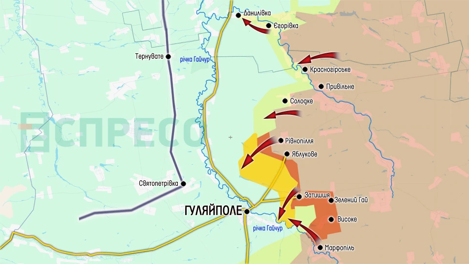 Карта бойових дій за 22-29 листопада, фото: ЕспресоЗа тиждень ворог завершив окупацію сіл Високе й Зелений Гай, обійшов наші лінії оборони, вибудувані у балках та наблизився до околиць Гуляйполя зі сходу та південного-сходу. Перші штурмовики вже почали вуличні бої на лівобережжі річки Гайчур по якій Сили оборони будуть вибудовувати лінію фронту. ЗСУ зайняли висоти на правому березі річки, де вибудувана наша лінія оборони, але окупанти можуть спробувати захопити Гуляйполе із півдня, адже тут вони вже давно, ще в 2022 році закріпились на правобережжі річки в районі села Марфопіль. І хоча наша оборона тут міцно вибудувана впродовж років, але нові обставини наступу ще й зі сходу можуть її похитнути. На північ від Гуляйполя росіяни все-таки намагаються просуватися нам у тил, але їхній наступ виснажений ударами ЗСУ і значно сповільнився. Тільки біля Рівнопілля ворог пробився на 2 км на захід. Однак в найбільш важливому для нас районі сіл Данилівка і Єгорівка наші воїни зацементували оборону. В районі Покровського та Новопавлівки фронт стабілізований, тривають позиційні бої без жодного просування окупантів.
