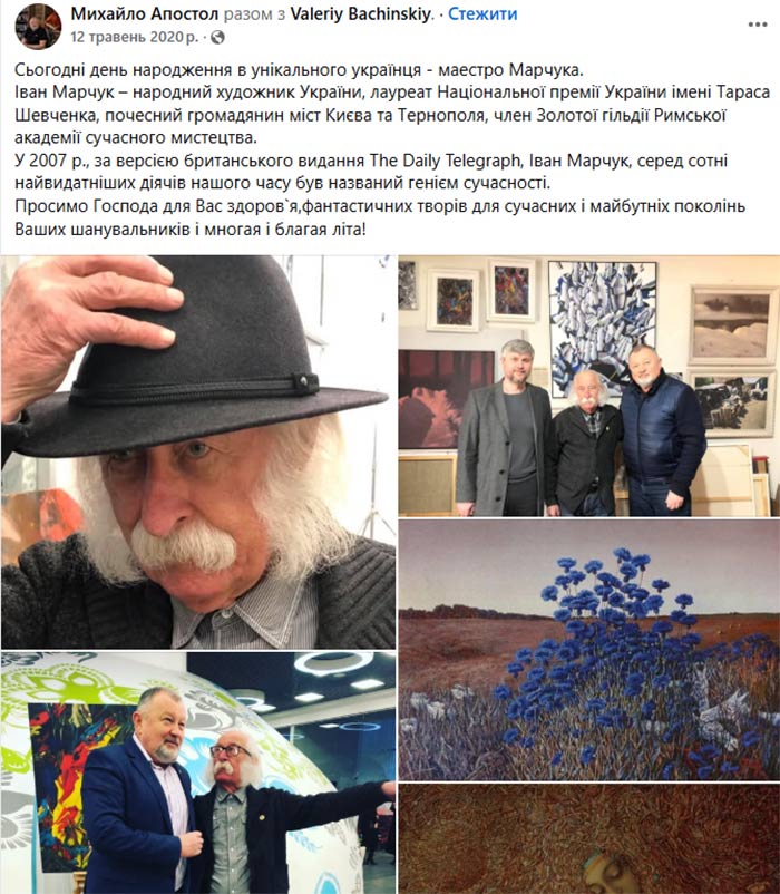 Починається скандальна детективна історія 12 травня 2020 року. У цей весняний день Іван Марчук відзначив 84-річчя. Славетного художника, як і зазвичай, вітали різні люди. Серед них був і колишній народний депутат, ексрадник міністра внутрішніх справ Арсена Авакова та земляк митця Михайло Апостол. «Просимо Господа для Вас здоров’я, фантастичних творів для сучасних і майбутніх поколінь Ваших шанувальників і многая і благая літа!» – через Facebook сипав побажаннями відомий на Тернопільщині політик.