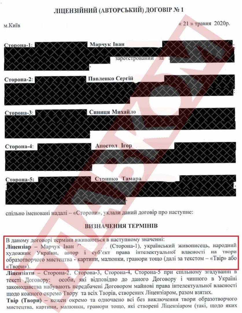 Врешті Апостол запропонував всім поїхати до майстерні художника на вулицю Євгена Чикаленка у Києві. А вже там Апостол сказав, що він має їхати у справах. Михайло Синиця та Тамара Стрипко піднялися до майстерні художника без політика. Коли ж вони переступили поріг, Іван Марчук, не читаючи документ, поставив свій підпис під ним. У розпорядженні «Главкома» опинилася копія цього документа. Йдеться про ліцензійний (авторський) договір із підписами п’яти людей: Івана Марчука, Сергія Павленка, Михайла Синиці, Ігоря Апостола (син екснардепа) та Тамари Стрипко.