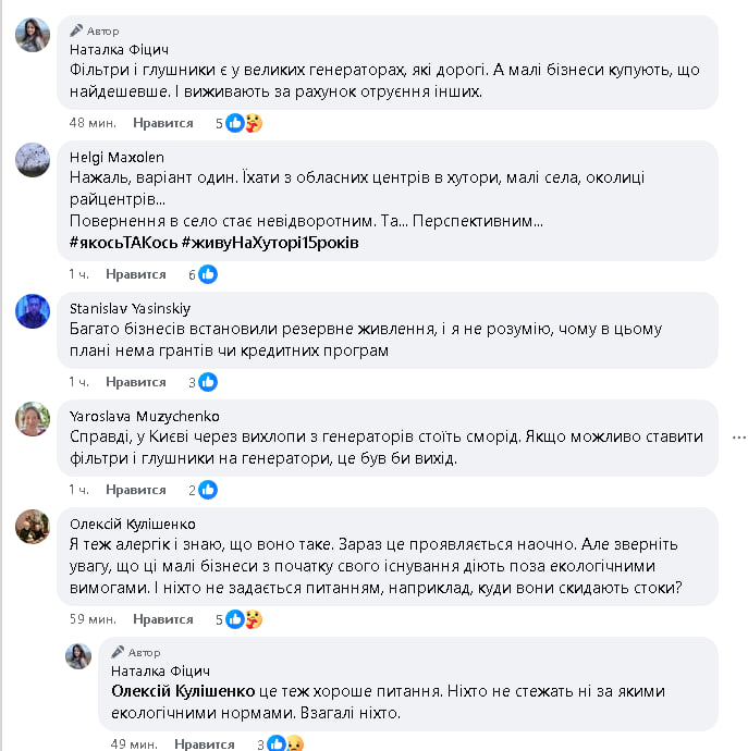 Користувачі активно коментують пост Наталки Фіцич. Багато хто відзначає, що малі бізнеси використовують дешеві генератори без фільтрів і глушників, створюючи сморід і шкодячи здоров’ю алергіків. Фіцич підтримала ці коментарі, погоджуючись, що за дотриманням екологічних правил практично ніхто не стежить.