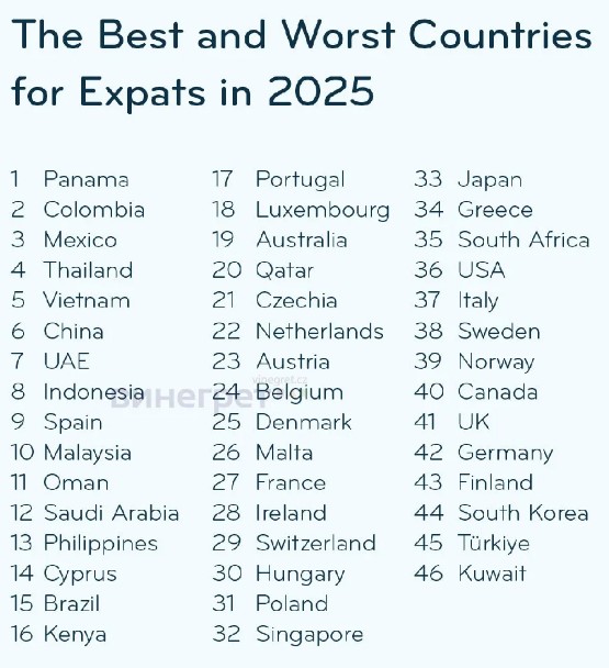 Загалом до підсумкового рейтингу 2025 року увійшли 46 держав. Оцінювання проводилося за п'ятьма основними групами критеріїв, включаючи якість життя, простоту інтеграції, умови праці, сімейне життя та особисті фінанси.