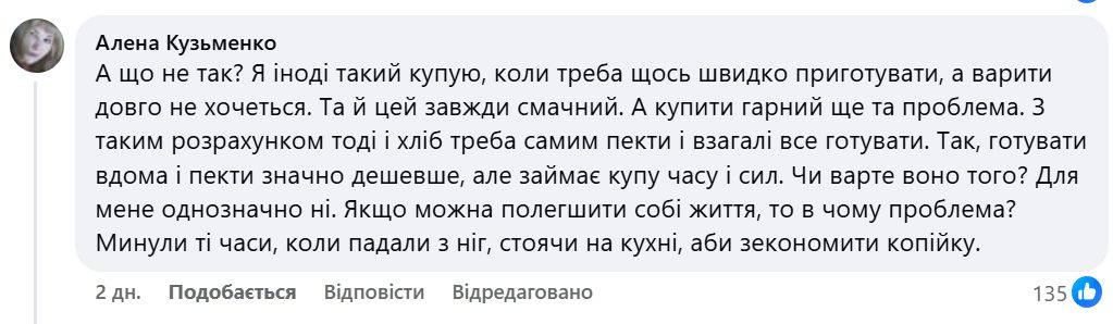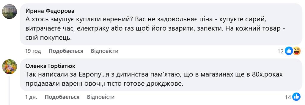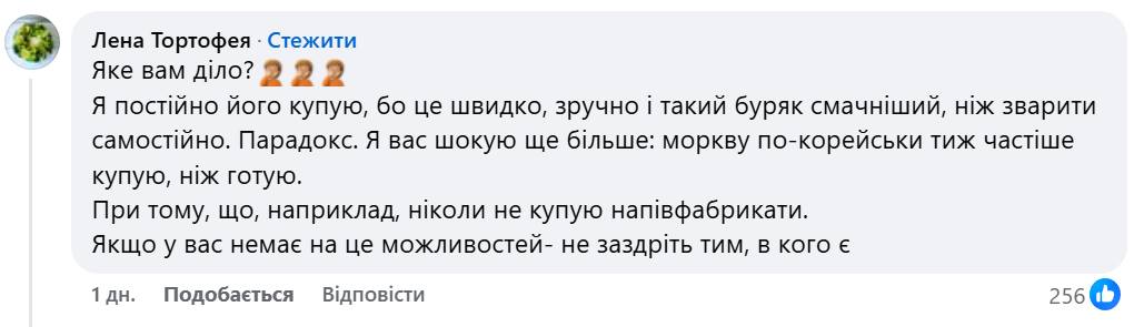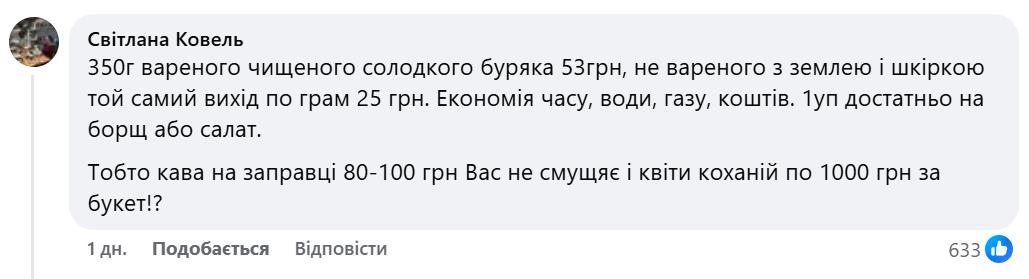 Однак коментатори, серед яких переважно жінки, стали на захист напівфабрикату. Вони підкреслили, що покупка такого буряка є значною економією часу, газу та води, особливо в умовах постійних відключень світла. Користувачі зазначають, що 350 грамів готового чищеного продукту достатньо для приготування борщу або салату, а різниця в ціні зі свіжим буряком виправдовується зручністю.