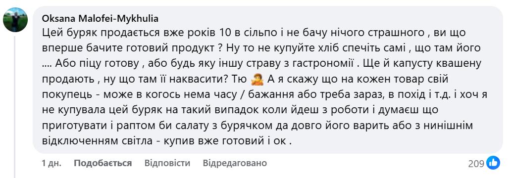 Багато користувачів вказали на те, що готовий буряк давно продається в інших мережах і завжди має свого покупця. Вони зауважили, що не варто обурюватися ціною на продукт, який пропонує високу швидкість приготування, якщо не викликають здивування ціни на каву на заправках чи готові страви з гастрономії. На їхню думку, на кожен товар, що пропонує комфорт, є свій споживач.