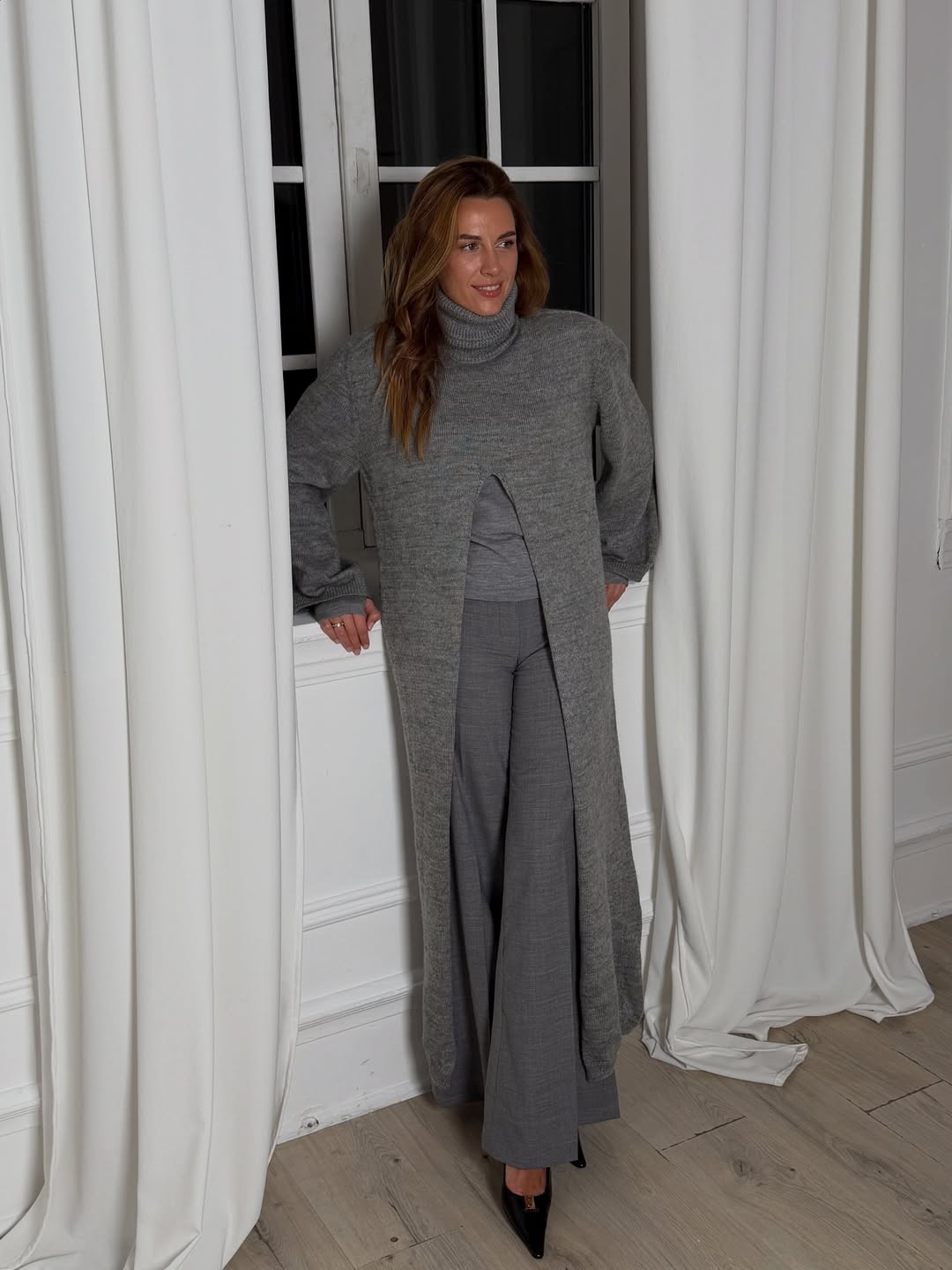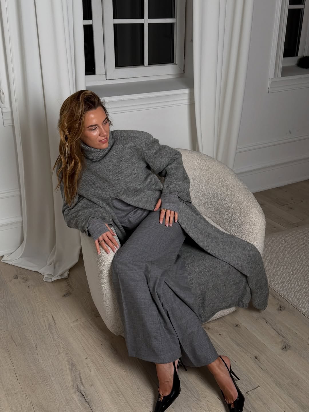 - Гра об'ємів : об'ємний верх і широкий крій штанів поєднуються з довжиною светра, створюючи баланс між комфортом і елегантністю.