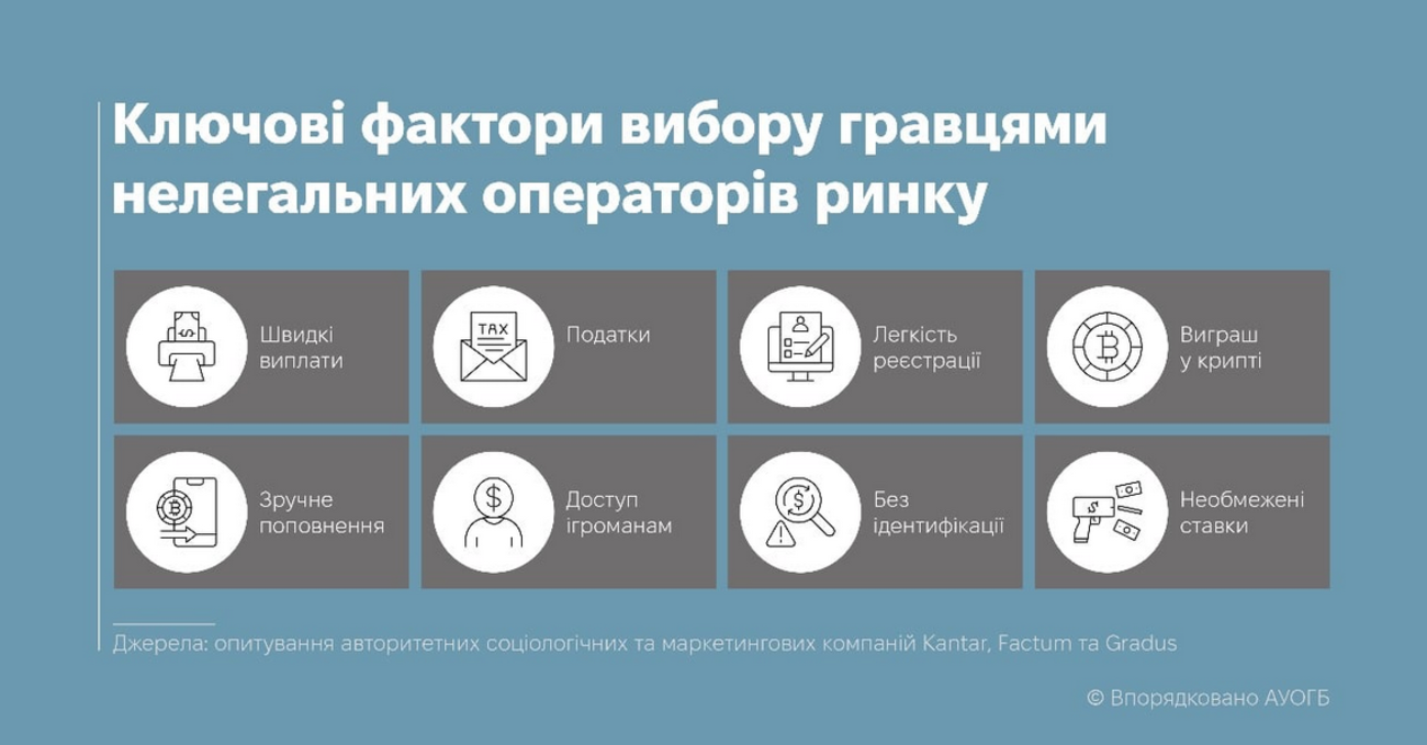 У серпні–вересні 2025 року компанії Kantar, Gradus і Factum провели три комплексні дослідження рівня тінізації гральної індустрії. Згідно з результатами, нелегальний сегмент становить від 39% до 53% ринку. Репрезентативне дослідження серед 2500 респондентів, які грають в інтернет-казино, виявило основні чинники, чому українці обирають нелегальні платформи: швидкість виплат; відсутність лімітів на ставки; можливість уникати сплати податків; простота реєстрації та анонімність; можливість грати за допомогою криптовалют; доступ для лудоманів і підлітків до 21 року. Дослідження продемонстрували, що будь-які обмеження чи незручності в легальних казино призводять до відтоку гравців у нелегальні інтернет-казино.