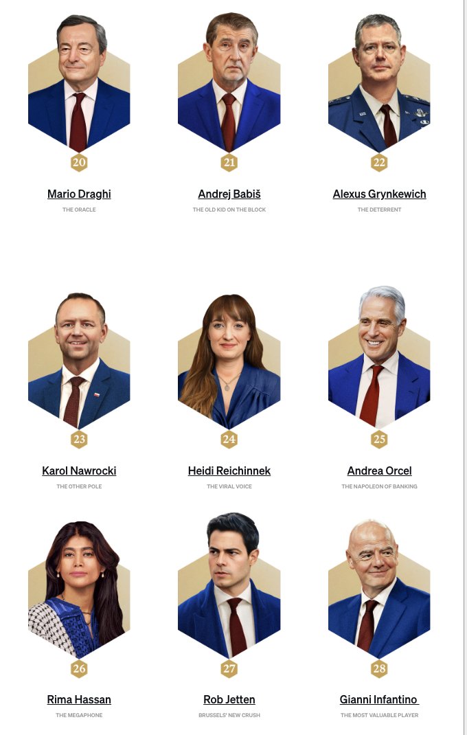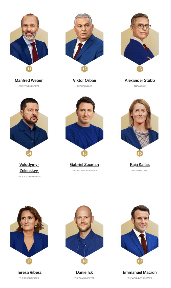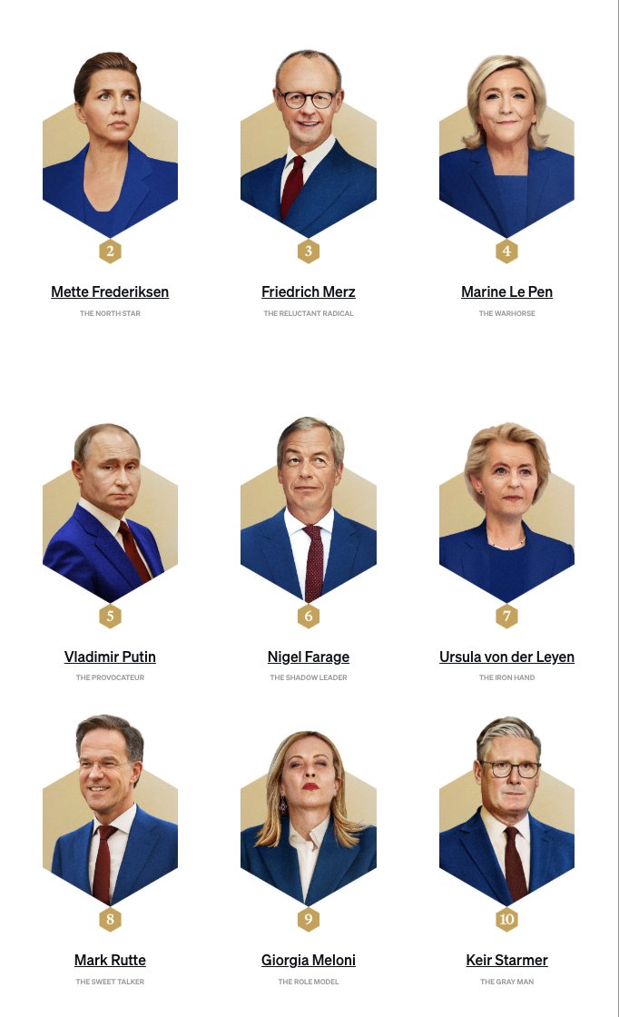 На першому місці рейтингу опинився президент США Дональд Трамп. За словами журналістів, цього року «ніхто не мав більшого впливу в Європі чи на неї, ніж очільник США». Також до першої п'ятірки увійшли прем'єр-міністерка Данії Метте Фредеріксен, канцлер Німеччини Фрідріх Мерц, лідерка французької партії «Національне об'єднання» Марін Ле Пен і російський диктатор Володимир Путін.