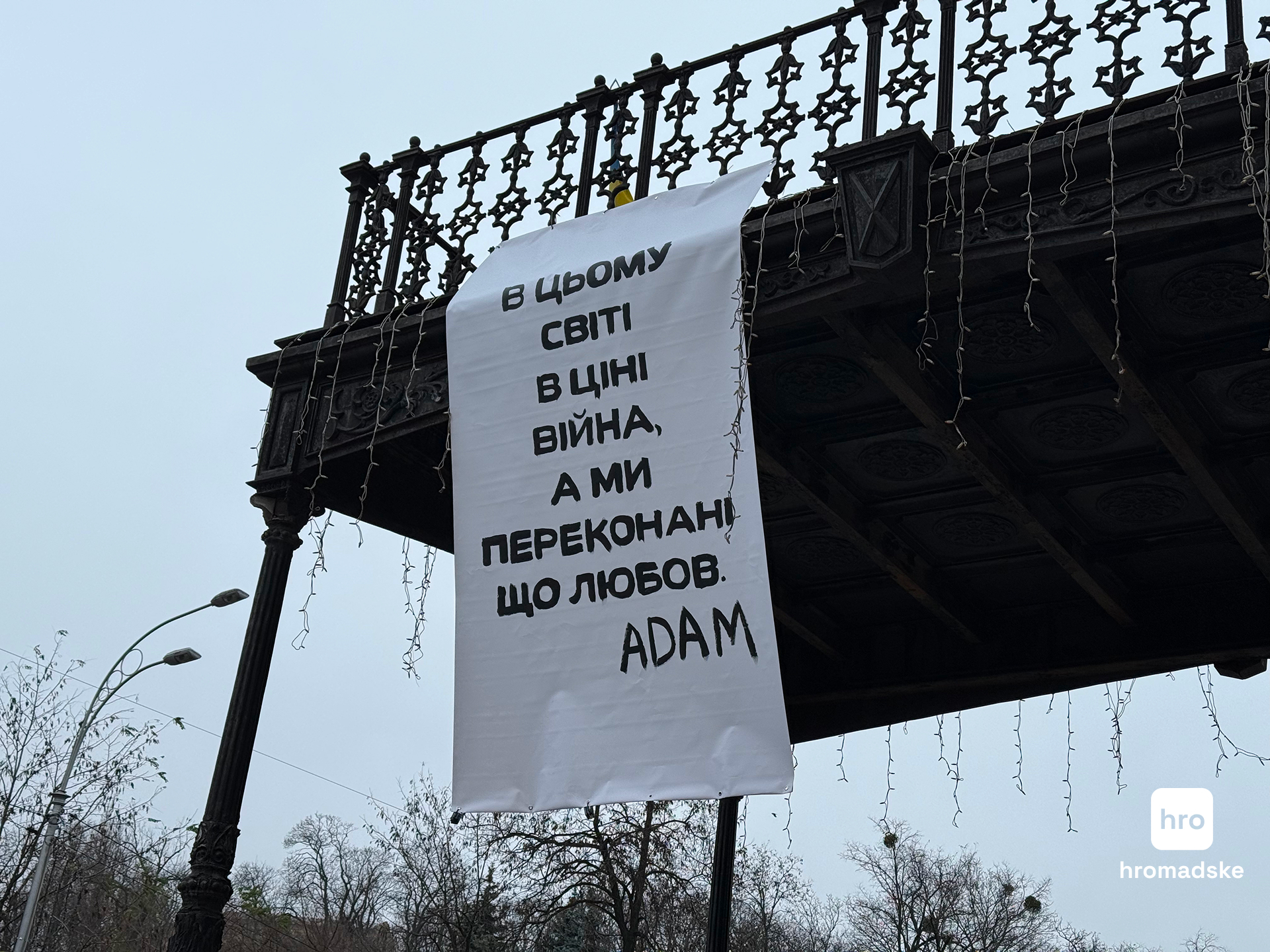 Вхід біля філармонії прикрасили мольбертами з цитатами з пісень Adam,. Серед них – рядки: «Танцюй зі мною повільно, хай зачекає світ божевільний», «Побудь зі мною, віддай мені себе, а я себе віддам». З балкону філармонії звисав великий банер з написом: «У цьому світі в ціні війна, А ми переконані, що любов…».