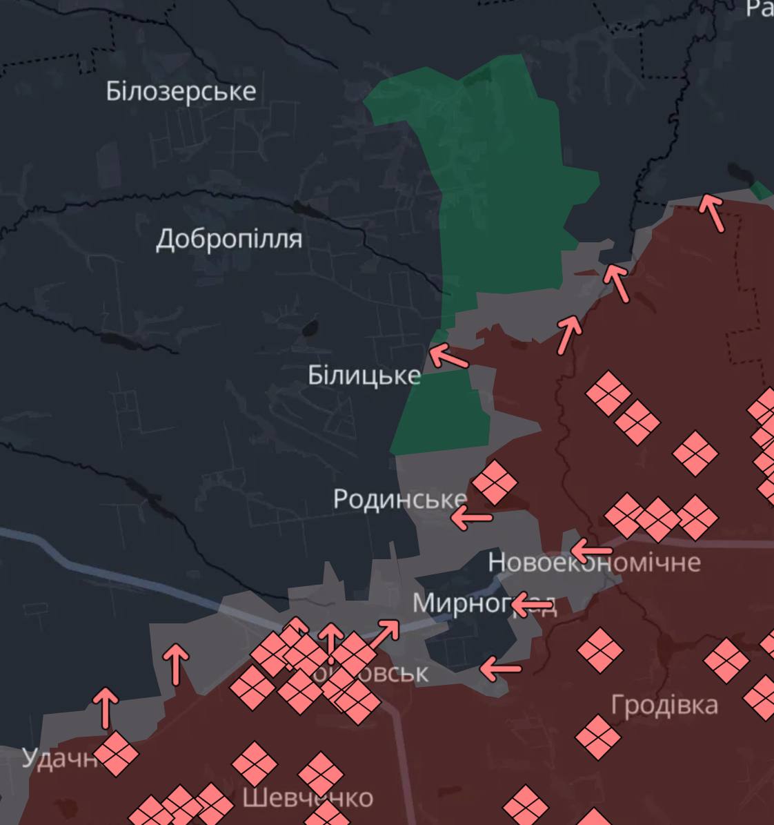 Від початку цієї доби противник 42 рази атакував у районах населених пунктів Шахове, Іванівка, Червоний Лиман, Мирноград, Гришине, Покровськ, Котлине, Удачне, Молодецьке, Дачне, Філія та у бік Новопідгороднього й Новопавлівки. Наші захисники стримують натиск противника, в п’яти локаціях бої досі тривають.