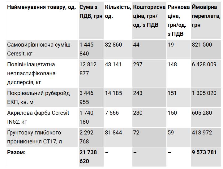 Орієнтовна переплата по цих позиціях складає більше 9 млн грн.