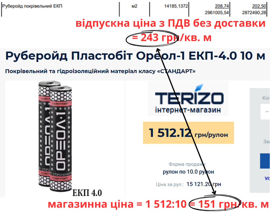 Невідомий покрівельний руберойд ЕКП замовили по 243 грн/кв. м. «ТК покрівля» продає руберойд Бікроеласт ЕКП-4 сірий сланець по 144 грн/кв. м, а «Terizo» пропонує руберойд Пластобіт Ореол-1 ЕКП-4 по 151 грн за кв. м. Це на 38-41% дешевше.