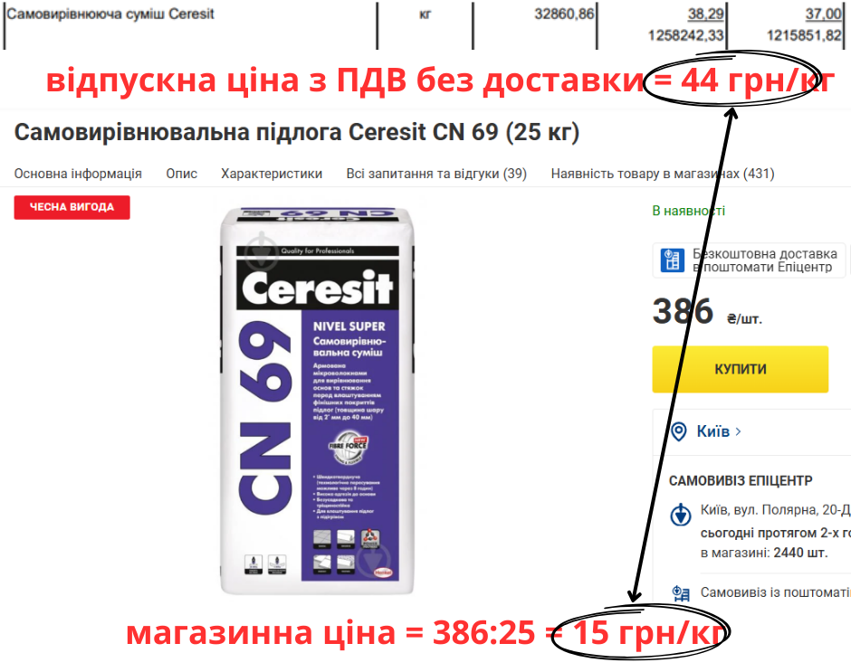 Самовирівнюючу суміш Ceresit замовили по 44 грн за кг, а «Епіцентр» продає самовирівнюючу суміш Ceresit CN69 по 19 грн за кг, що більше ніж вдвічі дешевше.