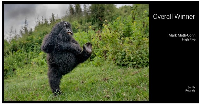 Найсмішнішу фотографію зробив британець Марк Мет Коен, який разом з колегами мандрував по горах Вірунга в Руанді в пошуках горил. В результаті вони зустріли сім'ю приматів Амахоро.