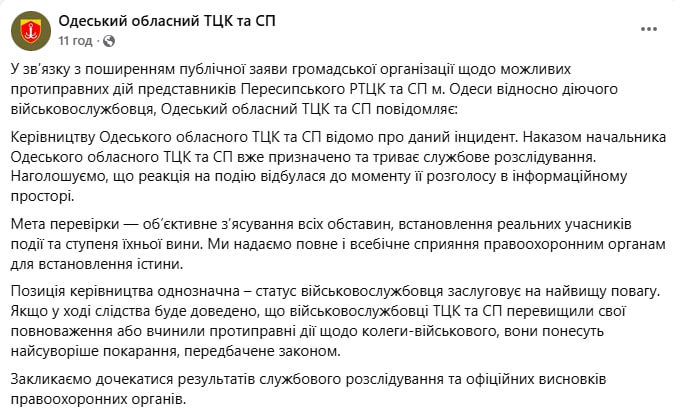 Одеський обласний ТЦК та СП розпочав службове розслідування після інциденту, що стався 4 грудня 2025 року в Одесі, пише «Главком».