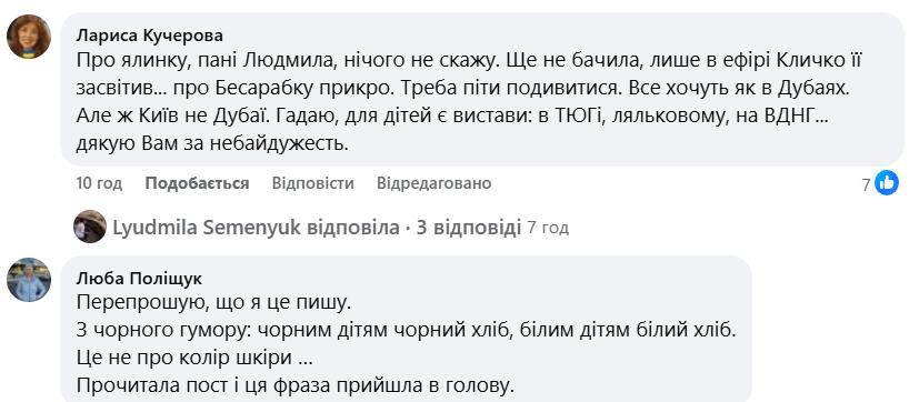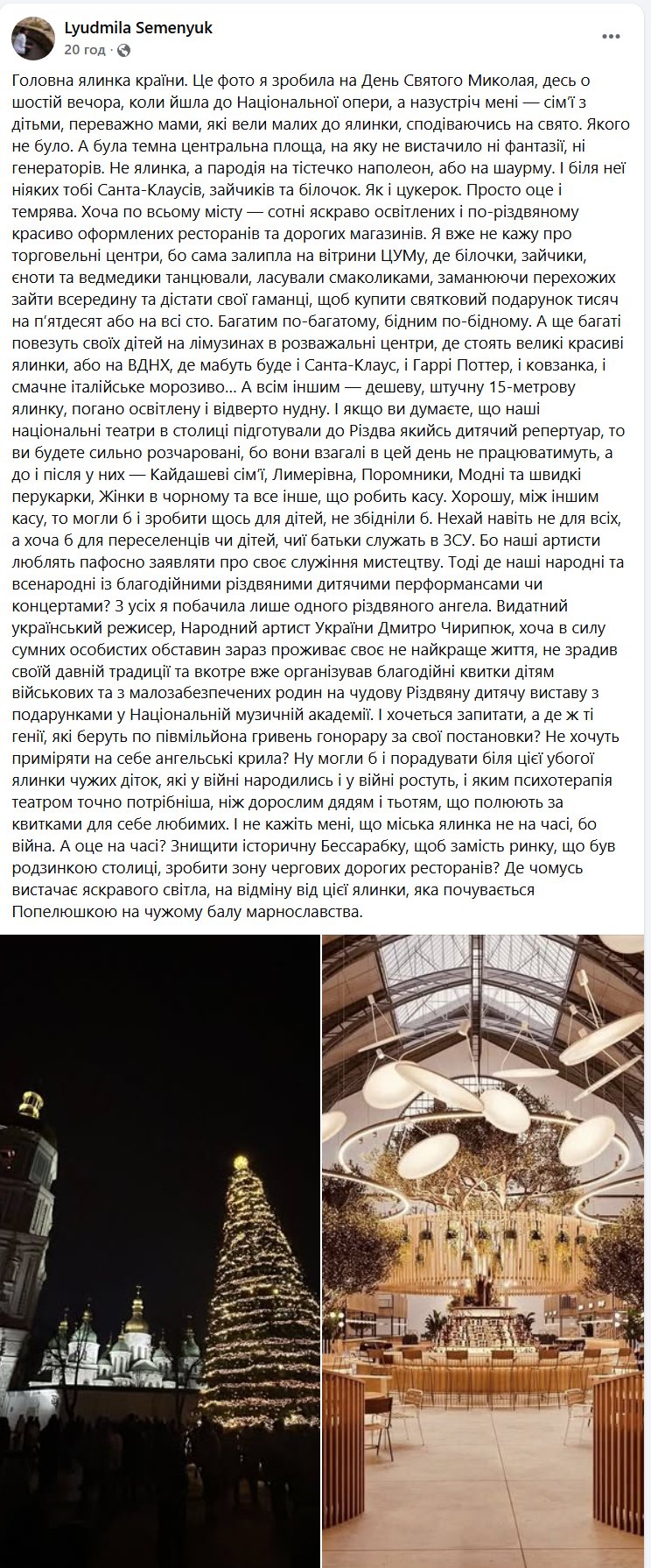 Людмила Семенюк гостро ставить питання про доцільність пріоритетів влади та бізнесу під час війни, критикуючи знищення історичної Бессарабки для створення чергової зони дорогих ресторанів, де «вистачає яскравого світла», на відміну від головної ялинки країни.
