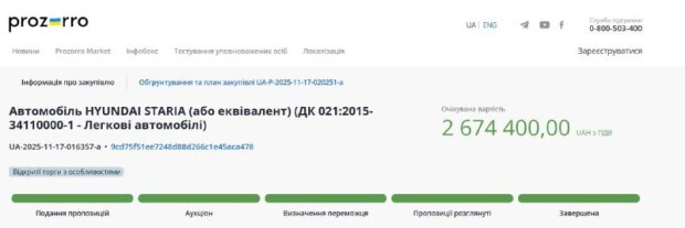 Комунальне підприємство «Сокиряни-Благоустрій» придбало семимісний мінівен Hyundai Staria Top 4WD 2025 року чорного кольору за 2,67 млн грн. Ця інформація доступна у відкритому посібнику на сайті Прозорро.