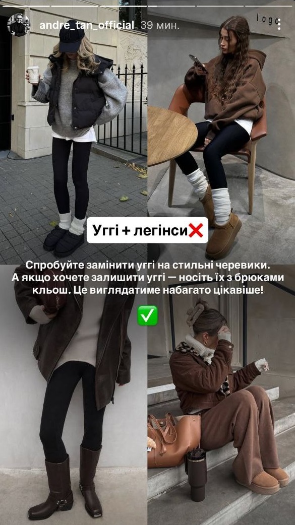 Андре Тан наголошує: якщо є бажання залишатися в тренді, слід відмовитися від цього поєднання. Замість уггів він радить звернути увагу на стильні черевики або іншу взуттєву класику, яка надає образу витонченості.