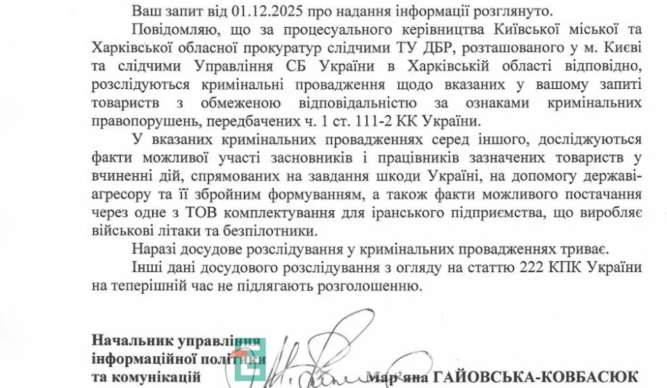 Про це для Еспресо повідомили у Офісі генерального прокурора України, відповідаючи на інформаційний запит.Йдеться про деталі, що в підсумку опинилися в іранській зброї, яку Росія використовує проти України"За процесуального керівництва Київської міської та Харківської обласної прокуратур, слідчими ТУ ДБР, слідчими управління СБ України у Харківській області, розслідуються кримінальні провадження щодо вказаних товариств з обмеженою відповідальністю за ознаками кримінальних правопорушень передбачених ч. 1, ст. 111-2 КК України", – йдеться у відповіді на запит.Вказана стаття передбачає відповідальність за пособництво державі-агресору. Винні за цією статтею, караються позбавленням волі на строк 10-12 років з позбавленням права обіймати певні посади або займатися певною діяльністю на 10-15 років, можливо з конфіскацією майна.