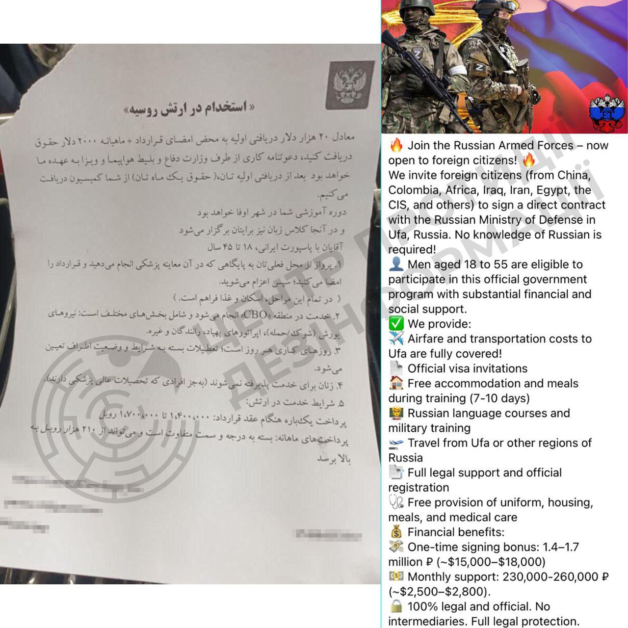 За інформацією ЦПД, у деяких містах Ірану почали з'являтися листівки із пропозиціями служби в армії Росії за «$20 тис. «підйомних» і приблизно $2 тис. щомісяця». Відомо, що дані з цих листівок ведуть до Telegram-каналу, де охочих вербують різними методами. Ця компанія координується РФ на території Ірану, за словами рекрутера, який розповів про це журналістам іранської служби Радіо Свобода.