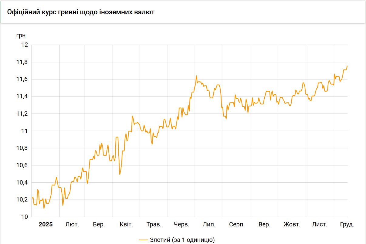 Офіційний курс на 16 грудня 2025 року встановлено на такому рівні: 11,7615 гривень за 1 злотий (зростання на 5 копійок порівняно з 15 грудня).