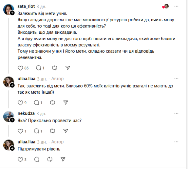 "Це чудова відповідь. Займаюсь англ і однією з умов є постійне виконання дз, інакше співпраця припиняється. І мені це дуже імпонує".