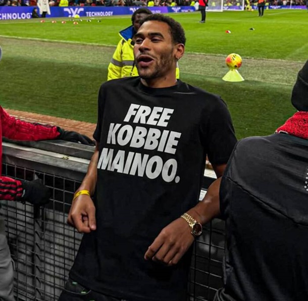 Зазначається, що Джордан Мейну - популярний у Великобританії блогер та інфлюенсер - з'явився у футболці з написом "Free Kobbie Mainoo".