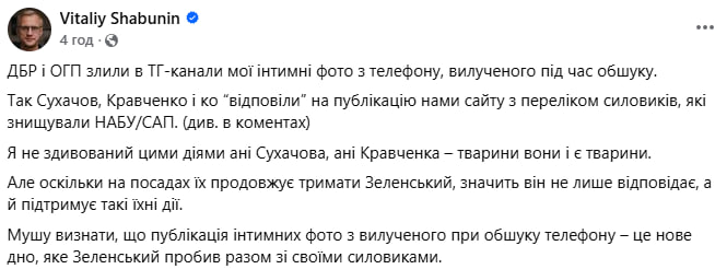 «ДБР і ОГП злили в ТГ-канали мої інтимні фото з телефону, вилученого під час обшуку. Так Сухачов, Кравченко і ко (Олексій Сухачов і Руслан Кравченко) відповіли на публікацію нами сайту з переліком силовиків, які знищували НАБУ/САП. Я не здивований цими діями ані Сухачова, ані Кравченка – тварини вони і є тварини. Але оскільки на посадах їх продовжує тримати Зеленський, значить він не лише відповідає, а й підтримує такі їхні дії», – написав Шабунін на своїй сторінці у Facebook.