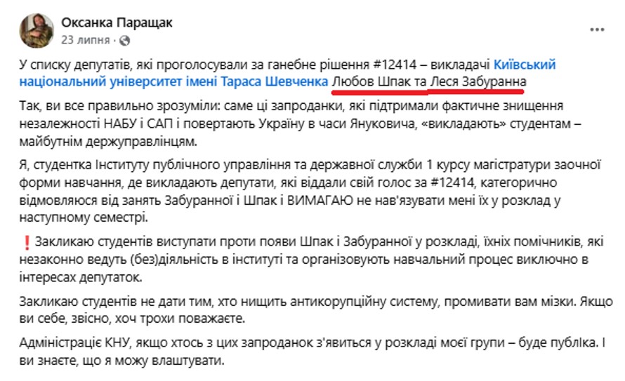 Якщо розглядати знакові голосування, які були пов’язані із протестами, то народна депутатка-викладачка Шпак також голосувала за засудження протестів на Банковій, коли мітингувальники вийшли підтримати Сергія Стерненка у 2021 році. З-поміж них було багато студентів. Тоді, нагадаємо, затримали та посадили під домашній арешт активіста і студента Романа Ратушного. Після повномасштабного вторгнення Ратушний пішов на фронт, і загинув як розвідник під час виконання бойового завдання.