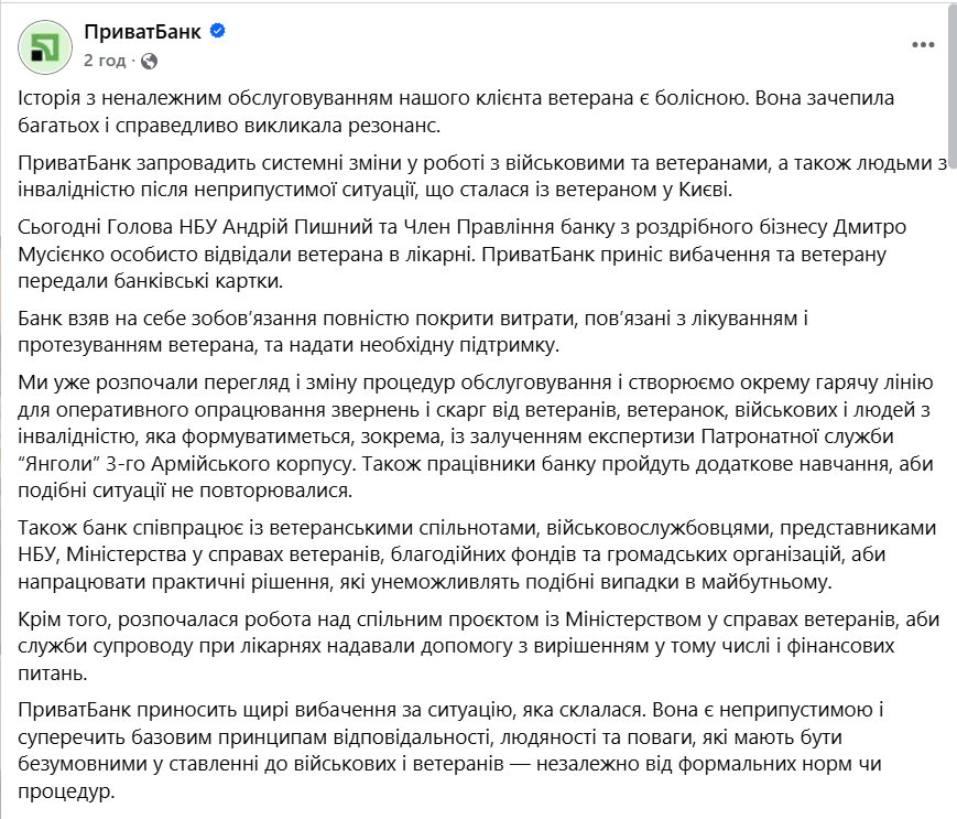 «Приватбанк запровадить системні зміни у роботі з військовими та ветеранами, а також людьми з інвалідністю після неприпустимої ситуації, що сталася із ветераном у Києві. Ми уже розпочали перегляд і зміну процедур обслуговування і створюємо окрему гарячу лінію для оперативного опрацювання звернень і скарг від ветеранів, ветеранок, військових і людей з інвалідністю, яка формуватиметься, зокрема, із залученням експертизи патронатної служби «Янголи» 3-го Армійського корпусу», – йдеться у повідомленні.