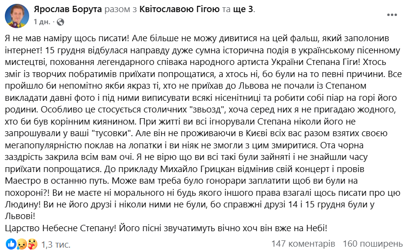 «Більше не можу дивитися на цей фальш, який заполонив інтернет! 15 грудня відбулася направду дуже сумна історична подія в українському пісенному мистецтві, поховання легендарного співака народного артиста України Степана Гіги! Хтось зміг із творчих побратимів приїхати попрощатися, а хтось ні, бо були на то певні причини. Все пройшло би непомітно якби якраз ті, хто не приїхав до Львова не почали із Степаном викладати давні фото і під ними виписувати всякі нісенітниці та робити собі піар на горі його родини», – написав артист.