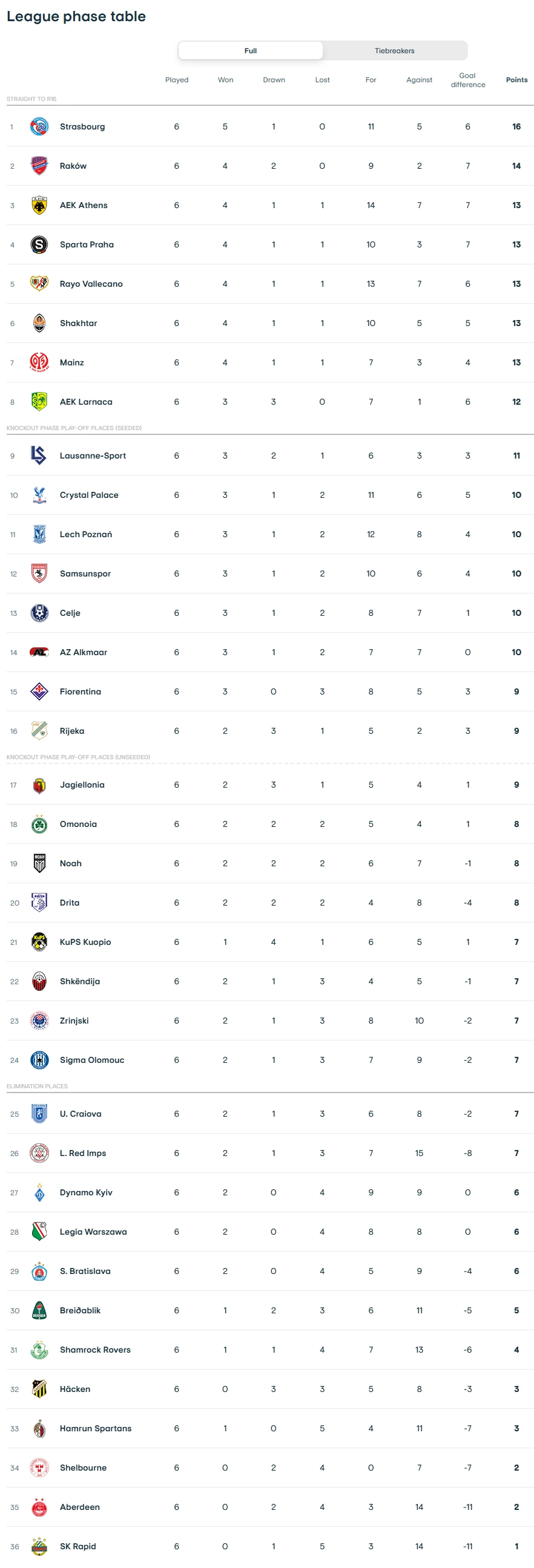 Про це повідомляє УЄФА."Шахтар" за підсумками 6-ти турів основного раунду третього за статусом єврокубкового турніру набрав 13 очок, посів шосте місце та напряму вийшов до 1/8 фіналу. Виграв основний раунд з 16 балами французький "Страсбург". Також оминули стикові матчі польський "Ракув" (14 пунктів), грецький АЕК, чеська "Спарта", іспанський "Райо Вальєкано", німецький "Майнц" (усі - по 13) та АЕК з Кіпру (12). Клуби, які фінішували на 9-24 місцях посперечаються за право зіграти у 1/8 фіналу в плей-оф. "Динамо" з 6 очками опинилося на 27-й позиції та вибуло з турніру. Жеребкування наступного раунду Ліги конференцій відбудеться 16 січня 2026 року.