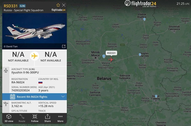 Вказується, що о 00.21 із Національного аеропорту Мінськ вилетів Іл-96-300ПУ з реєстраційним номером RA-96024. Слідом за ним вилетів і борт-двійник із речником російського диктатора Дмитром Пєсковим (RA-96021).