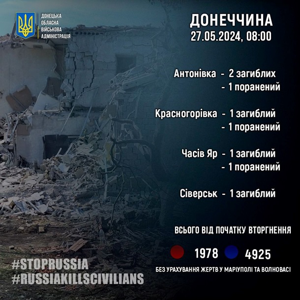 "За 26 травня росіяни вбили 5 жителів Донеччини: 2 в Антонівці, по 1 - у Сіверську, Красногорівці і Часовому Яру. Ще 3 людини в області за добу дістали поранення", - йдеться в повідомленні.