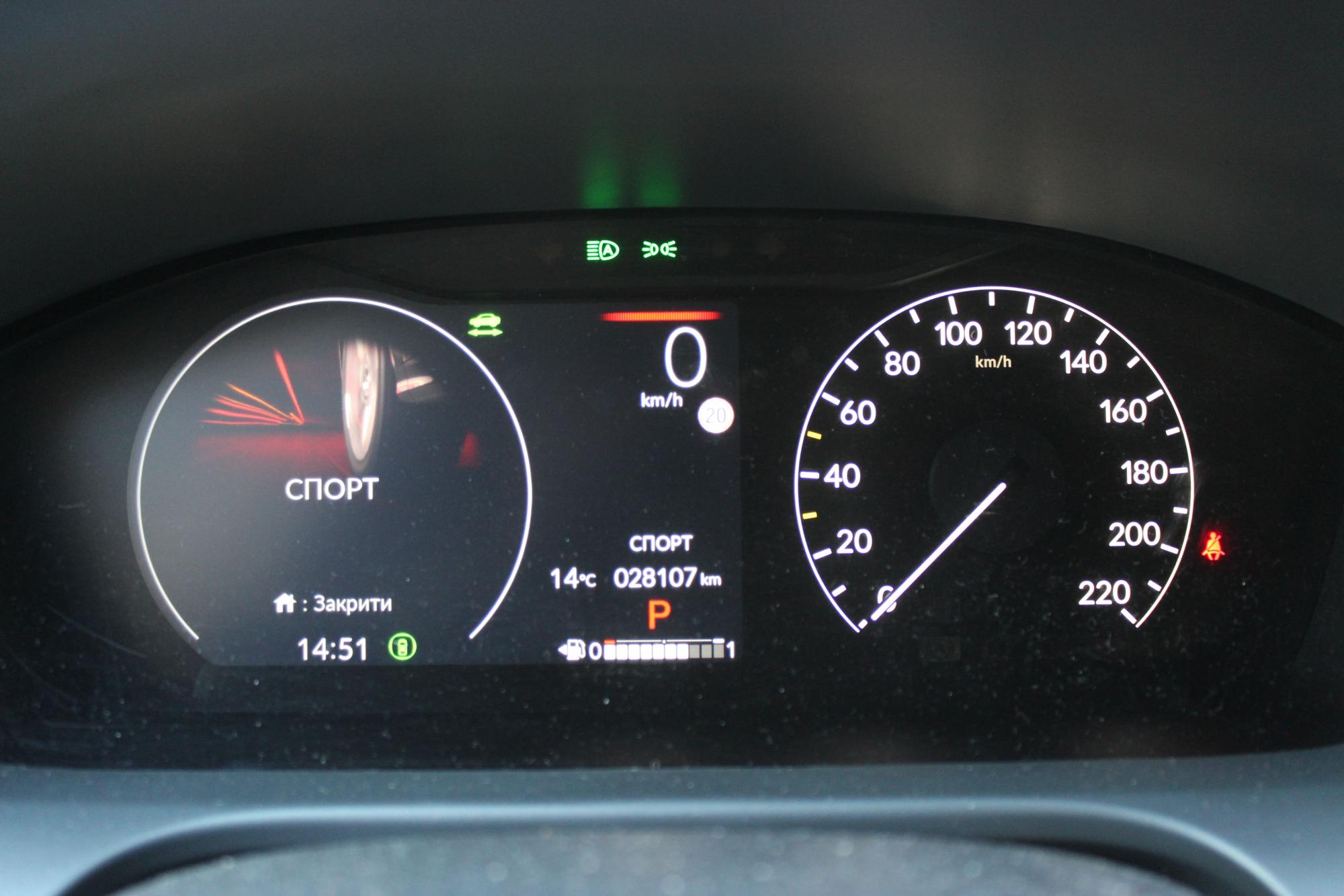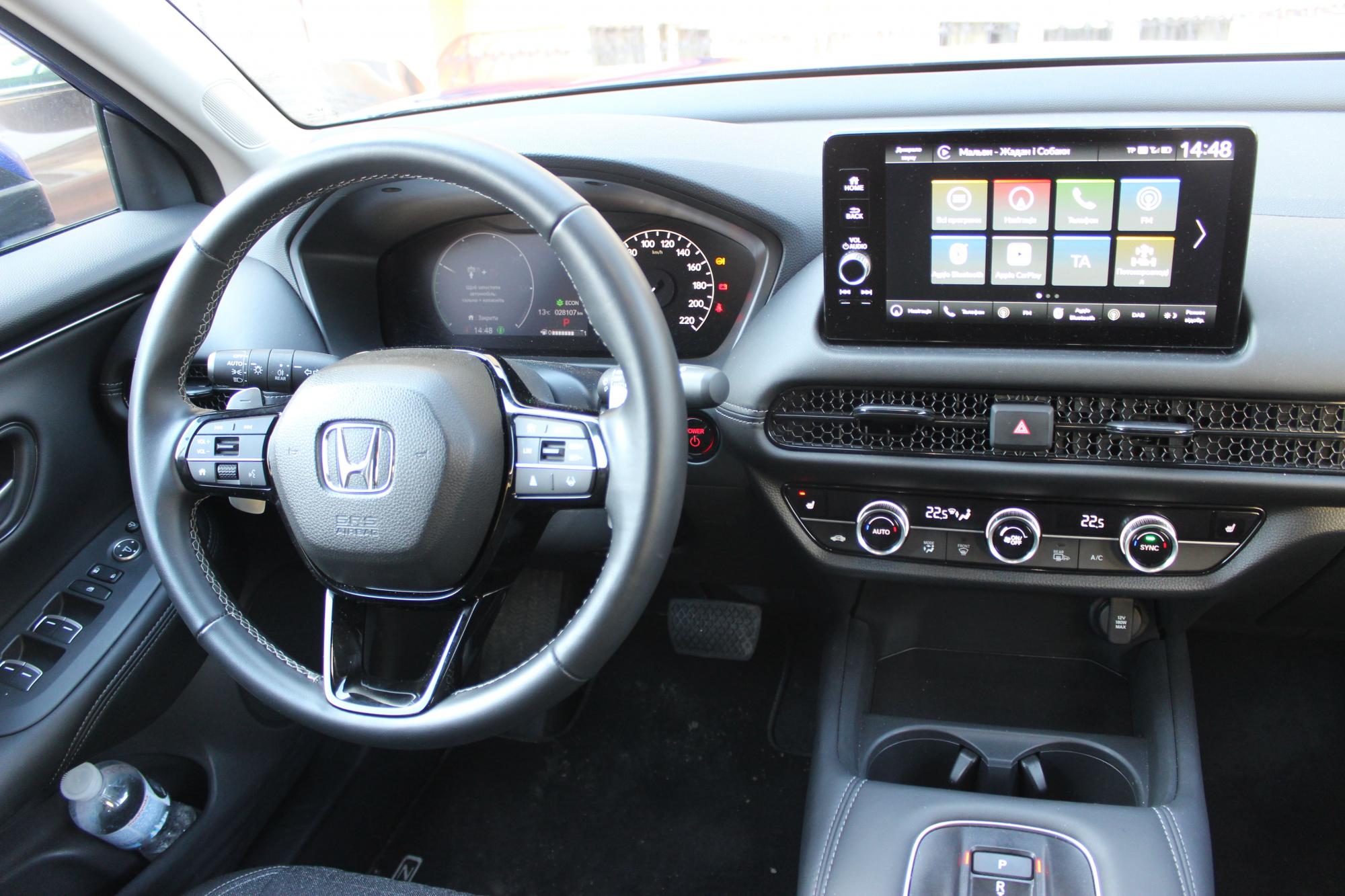 Спорідненість із Civic повною мірою простежується в салоні: передня панель у моделі ZR-V має схожу архітектуру з компактною центральною консоллю і об'єднаними в єдину лінію дефлекторами вентиляції. Кросовер має частково віртуальні прилади з екраном у лівій частині панелі та дисплей медіасистеми на 9,1 дюйма. За кермом розташувались перемикачі. Спочатку сподіваєшся, що вони відповідають за вибір передачі трансмісії. Але згодом розумієш, що у машини й КПП як такої немає. Їх задача – регулювати режим інтенсивності рекуперації при гальмуванні гібридною системою.