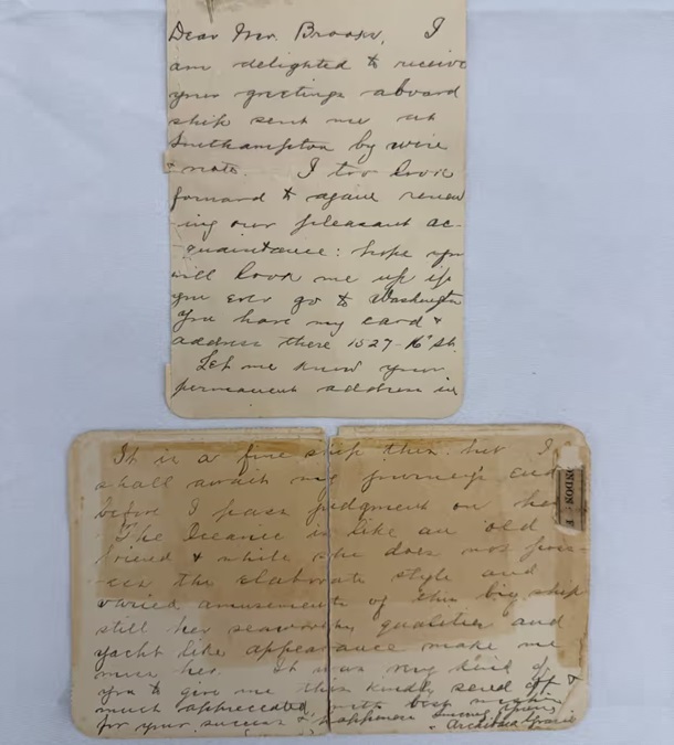 Лист датований 10 квітня 1912 року, днем, коли він піднявся на борт, і поштовим штемпелем Квінстаун 15:45 11 квітня та Лондон 12 квітня.