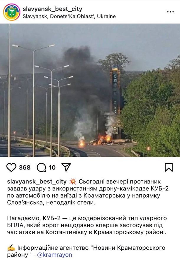 Вже ввечері 4 травня ворог завдав удару з використанням нового дрону по цивільному автомобілю на виїзді з Краматорська в бік Слов’янська, повідомляють місцеві пабліки.